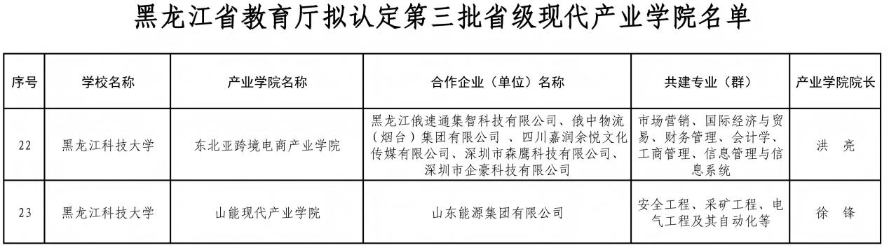 近日,黑龙江省教育厅公布了第三批省级现代产业学院拟认定名单,我校“东北亚跨境电商产业学院”“山能现代产业学院”2个产业学院成功入选。至此,我校省级现代产业学院增至5个,标志着学校在深化产教融合、服务区域产业发展方面取得新突破。